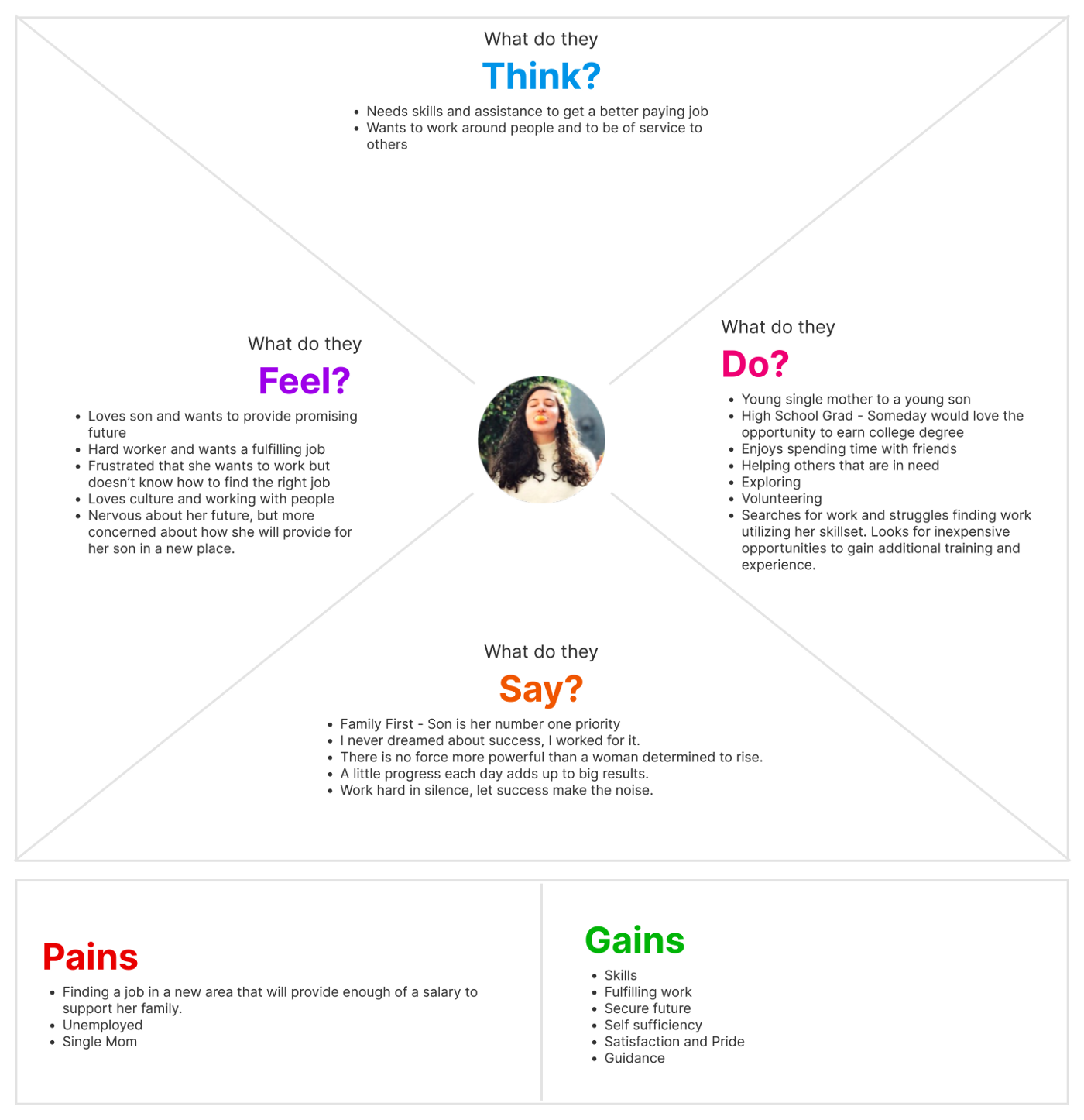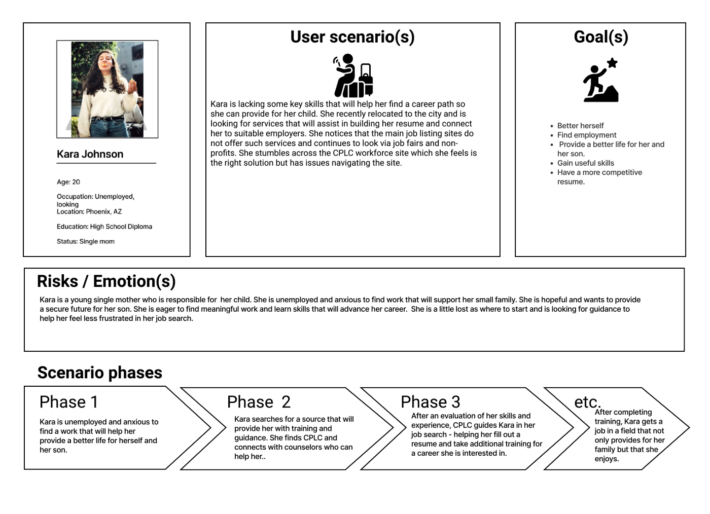 Our proto persona is Kara, a young single mother looking for work in the Phoenix, Arizona area. She has completed high school but is looking for work that not only will provide enough money to support her and her toddler son, but also has potential for growth and gaining new skills. Kara has a love for people and is a hard worker, but she has struggled navigating the world of unemployment. She hopes to be self sufficient with a secure future but feels overwhelmed and unconfident due to her lack of training. She finds CPLC as a promising resource to help her find the perfect job.