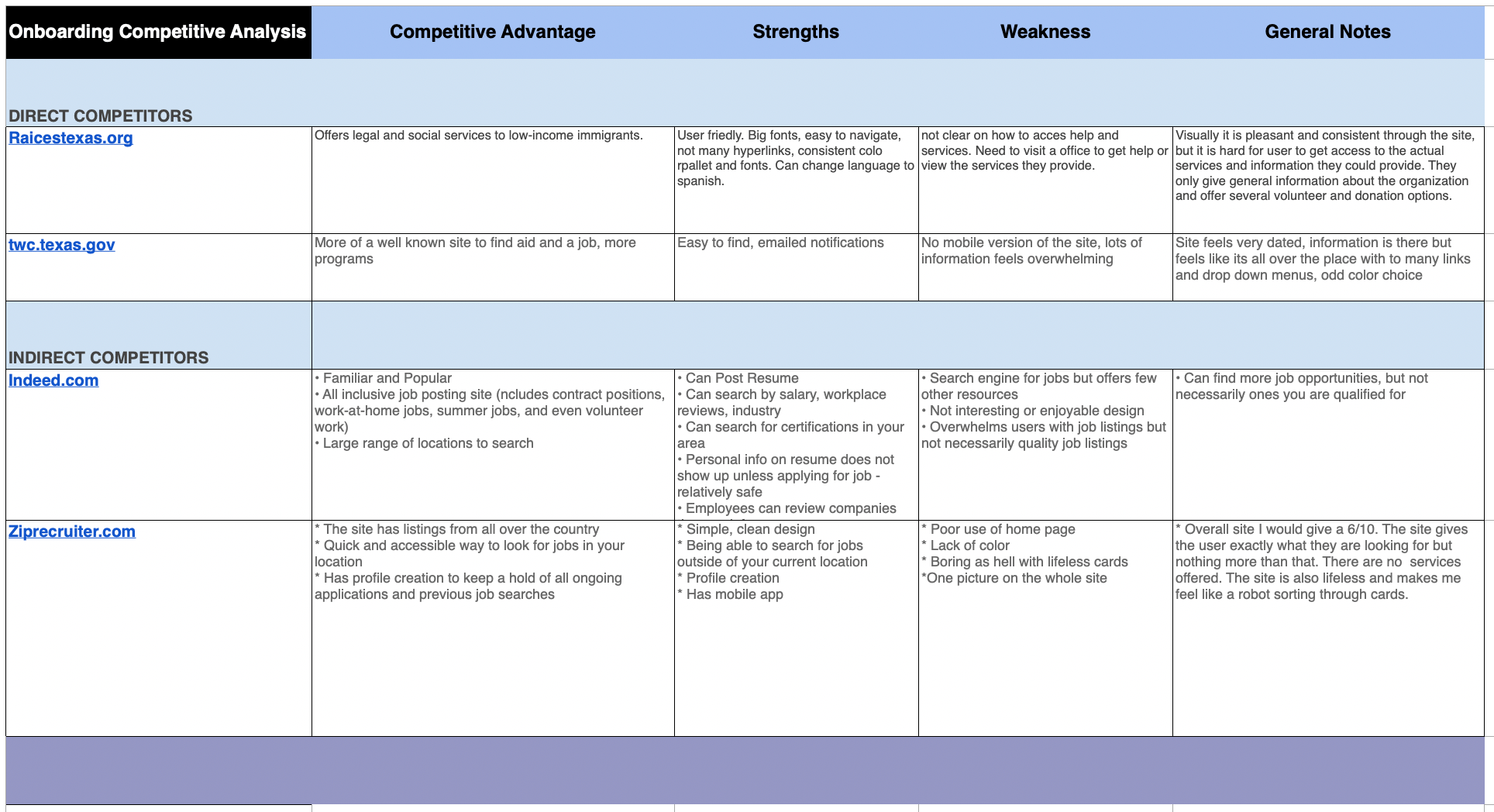 We looked first at “competitors” who offered similar services. Our nonprofit isn’t competing with these companies, per se, but they offer similar services. What were their competitors strengths and weaknesses? How might we be inspired by learning about what users appreciated from those sites?