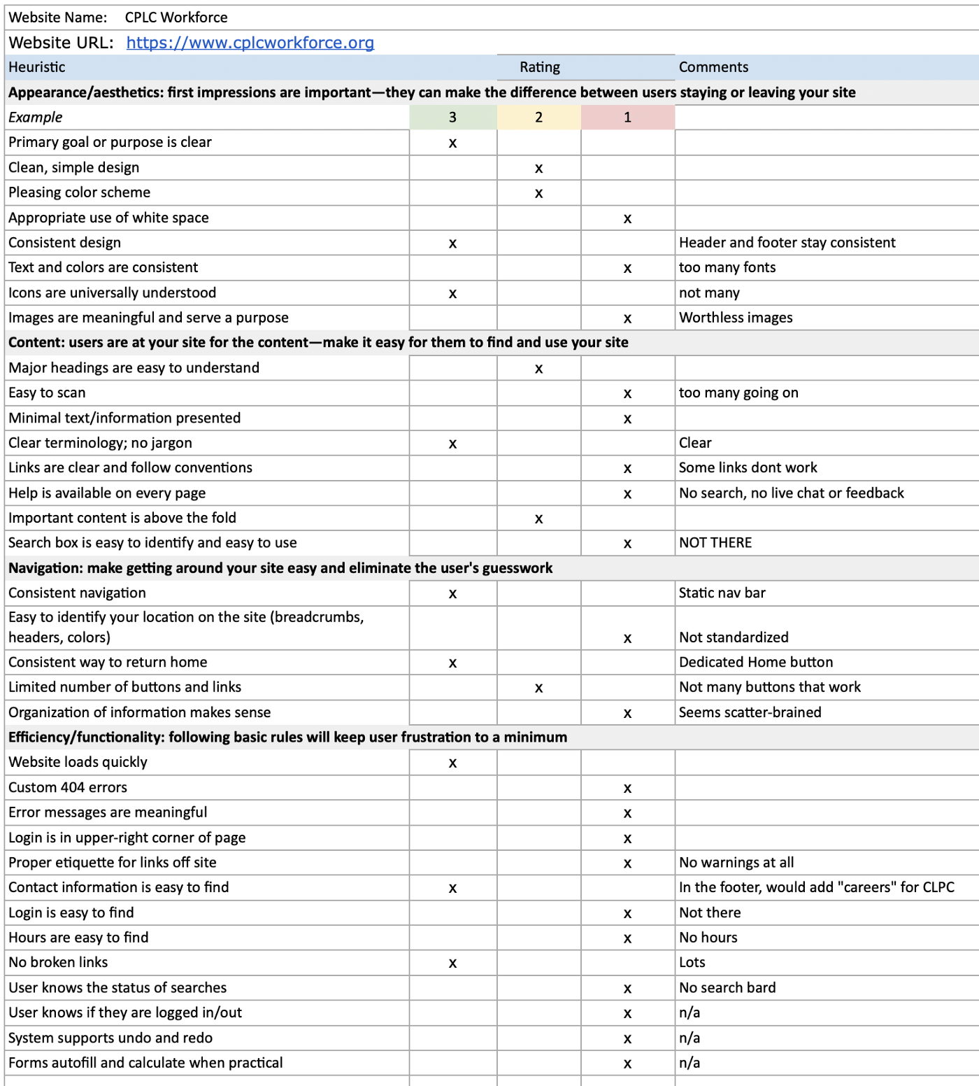 We next did a heuristic evaluation of the CPLC Workforce website. A few key points we pulled from this evaluation was that the homepage wasn’t entirely clear on what services the CPLC Workforce offered. A user has to navigate throughout several pages to see what training is available and when it is available. Many of the links don’t lead to content that is informative. Users struggling to navigate the site also didn’t have a search bar to help assist them in finding information they needed.