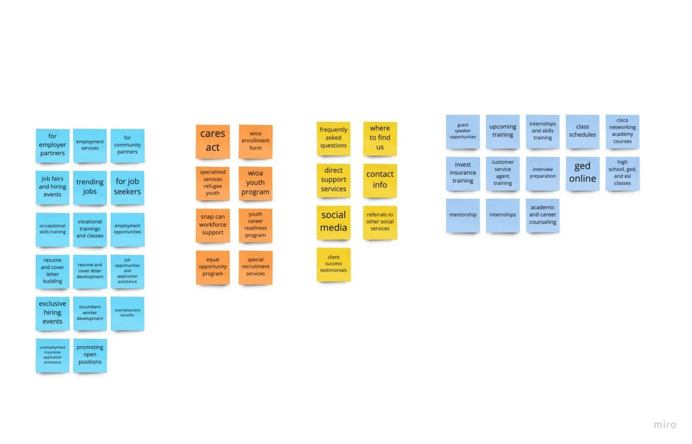 We reviewed what the current website offers and did a card sort on how we felt the site should be navigated. We chose four categories: Academic, Job Opportunities, Programs and Services.