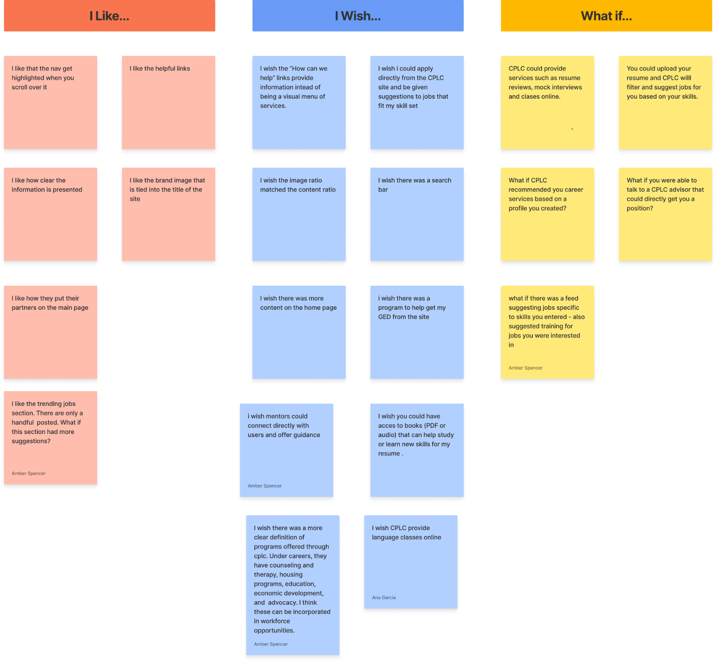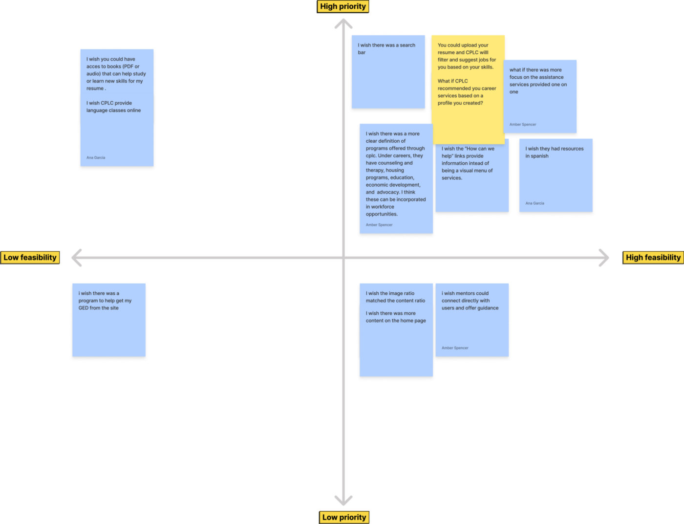 In reviewing the current website design, we began the “I Like, I Wish, What If” design thinking process. From that, we designed a feature priority matrix to help us prioritize which features we should focus on at this point in redesign.