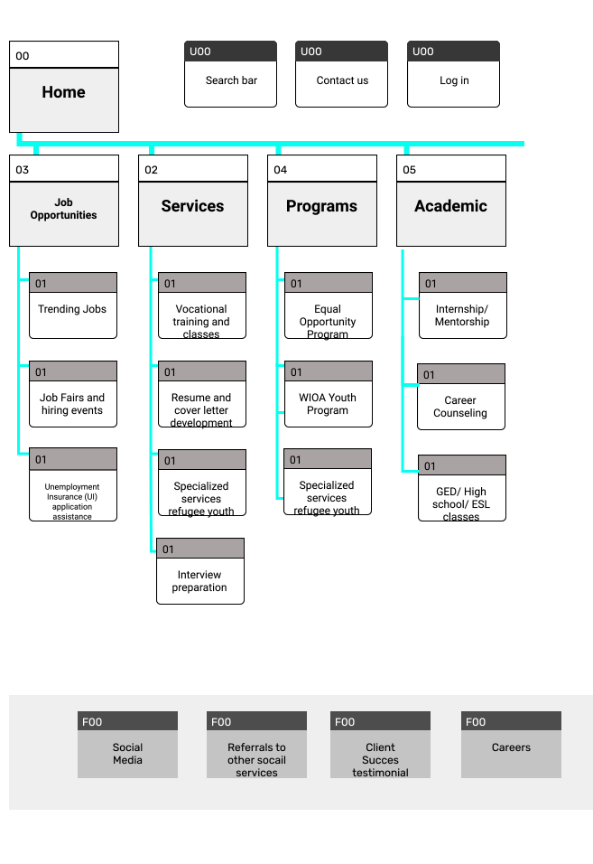 From our card sorting activity, we designed our original site map, focusing on what we think are user priorities: job opportunities, services provided, programs provided, and academic opportunities.