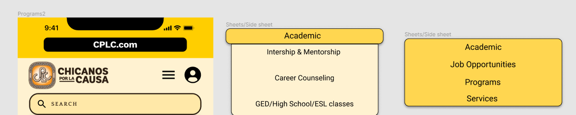 As we moved into a mid/hifi prototype we made adjustments based off user testing. Below is an example of our navigation iterations.